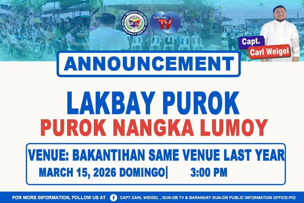 Giimbitar ang tanang lumulupyo sa Purok Nangka Lumoy sa umaabot nga Lakbay Purok nga pagahimoon aron paminawon ang inyong mga kabalaka, sugyot, ug panginahanglan sa komunidad. Kini usa ka higayon sa pagtinabangay aron mas mapalambo pa ang atong barangay.