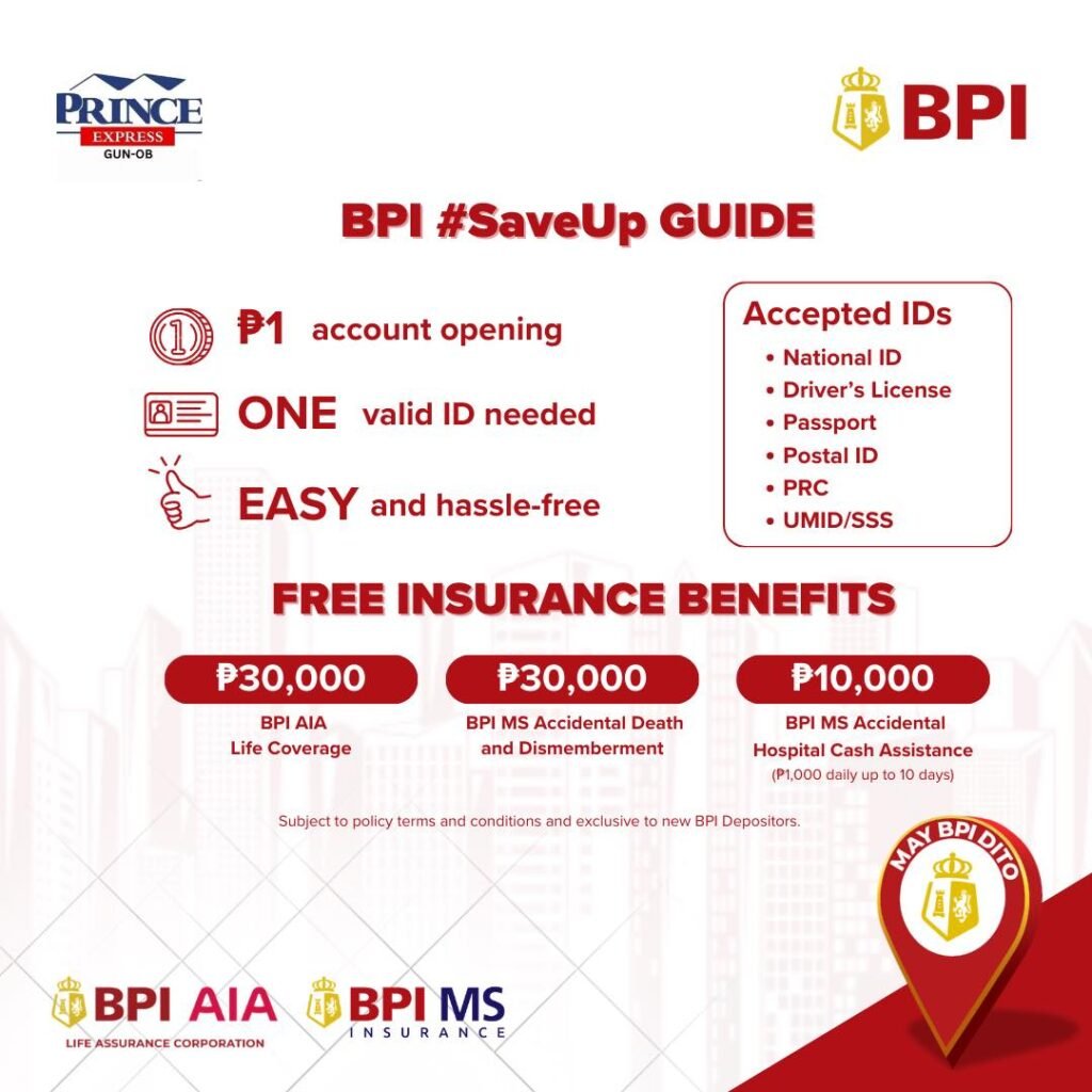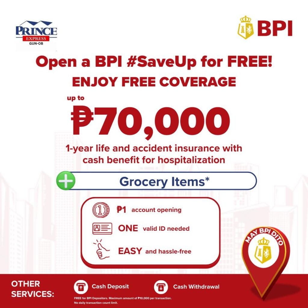 Sa mga wala paβy BPI account, pagdala lang ug 1 Valid ID ug cellphone, ug pwede na makapag-open sa BPI #SaveUp Savings Account nga adunay FREE β±70,000 Accident & Life Insurance!