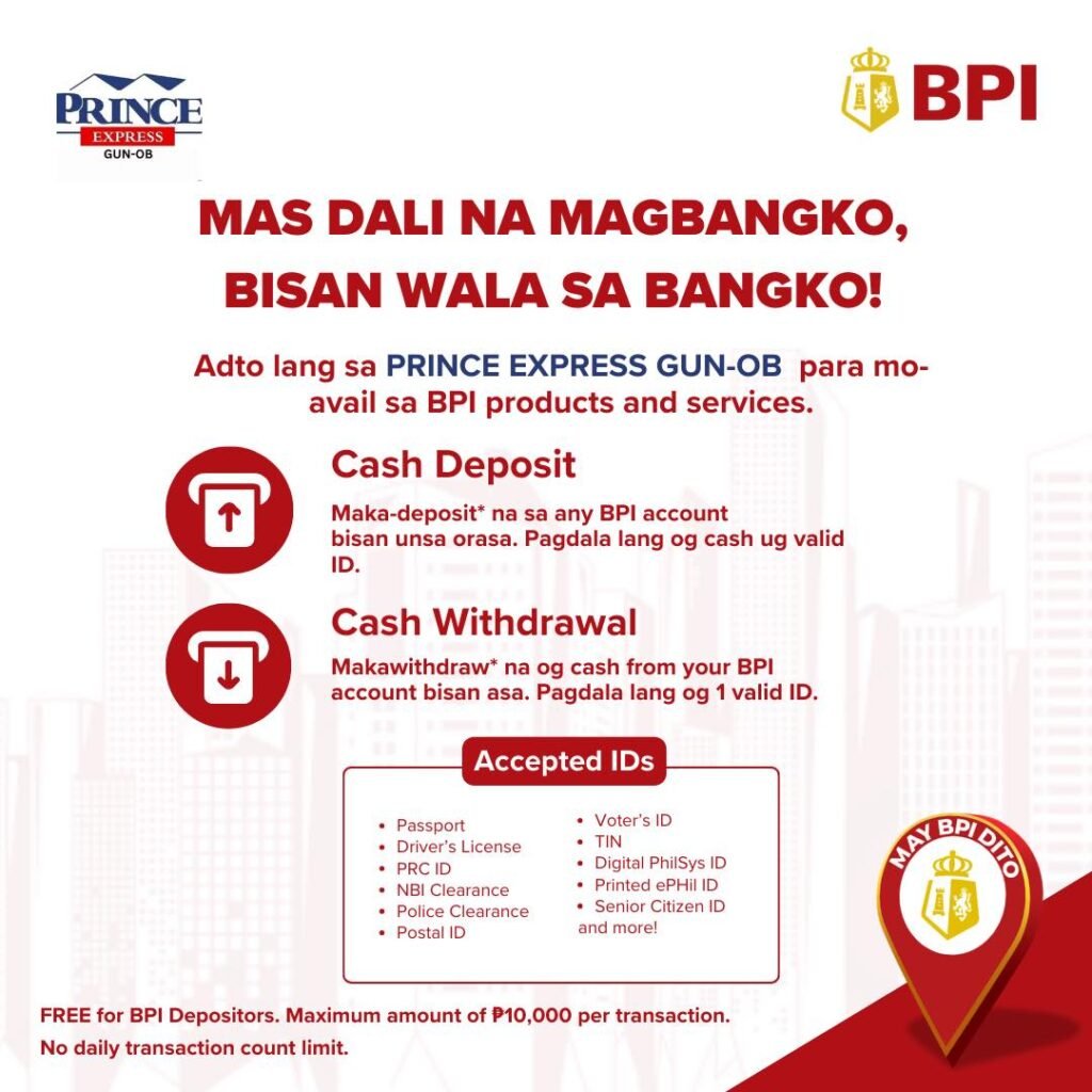 Libre ang cash withdrawal ug deposit sa Prince Express Gun-ob