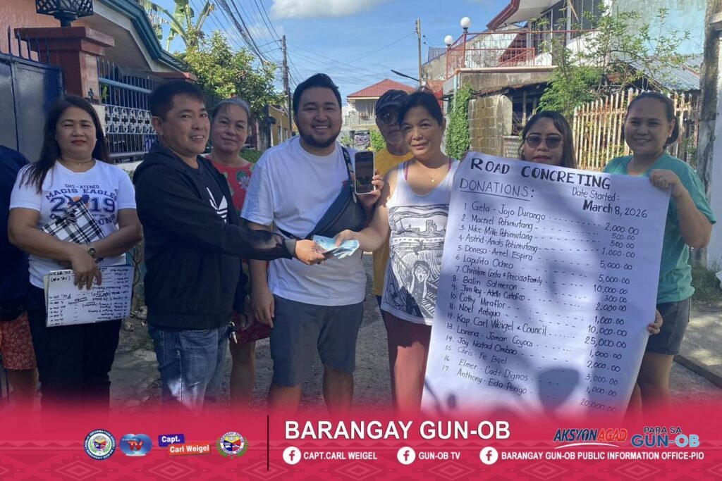 Personal nga gi-turnover ni Capt. Carl Weigel ug Konsehal Tico SoroΓ±o ang ilang donasyon ngadto sa tibuok Barangay Council isip suporta sa maong proyekto nga nagtinguha sa pagpaayo sa dalan alang sa kaayohan sa tanang residente sa lugar.