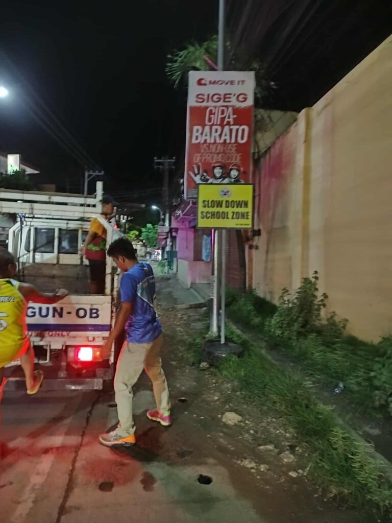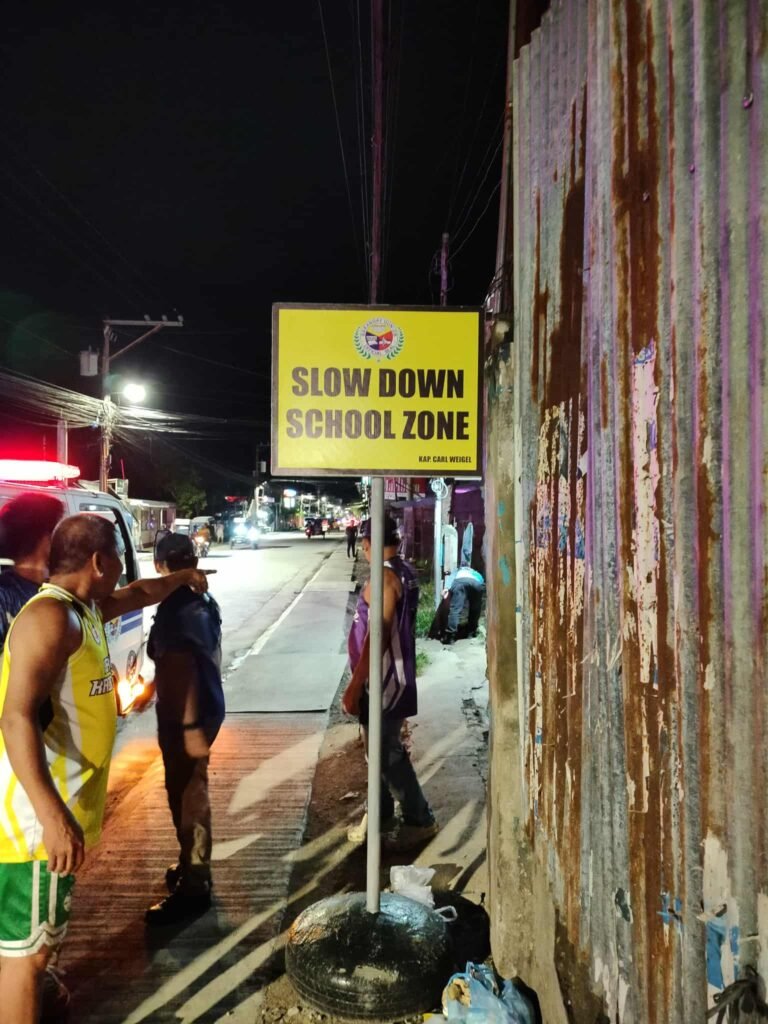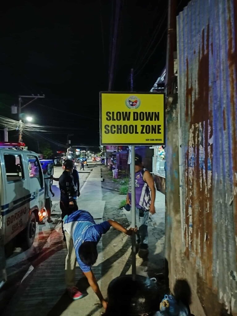 Kagabii, ang atong mga sakop sa Barangay Peace and Security Office (BPSO) inubanan sa Barangay Disaster Risk Reduction and Management Office (BDRRMO) Team nanaud ug mga βSLOW DOWN, SCHOOL ZONE AREAβ signages sa nagkalain-laing tunghaan dinhi sa atong barangay.