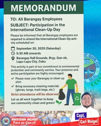 TO: All Barangay EmployeesFROM: Office of the Barangay CaptainSUBJECT: Participation in the International Clean-Up Day…